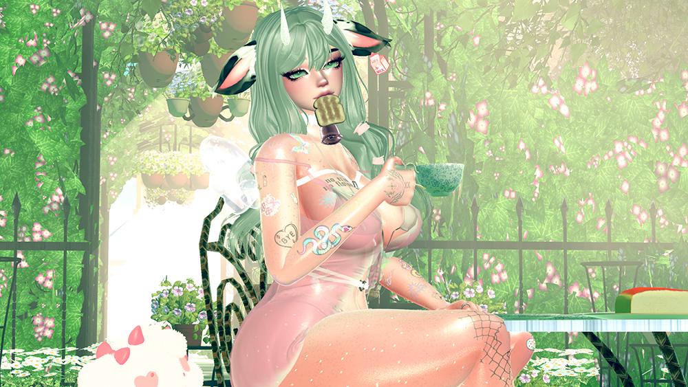 HEAD by Sivka / Body and Nails and Rings by Zinpia and Honeylab / Head and Body and Tattoo by miing, YingYangVR, and France / Eye Textures by Fair / Toast by Violet Puppy / Hair 1 2 3 4 5 by Saikura, Yuuriii, and Nessy / Hat by seo/ Eyepatch by LunaMaiEye / Horns by Kold. / Glasses by tobsii / Earrings by Milky Mommy/ Sweater by Weeeby / Babydoll Outfit, Mookini, Bra, skirt by hoeyume / Crop Top by Xiggli / Shorts by holoexe / Boyfriend Shirt by devilmk / Leggings and Boots by LokisVanity / Warmers by ZenifyyVR / Wings by Gell / Fishnets by flexuh / Cow Bell by jorbur / Cow plushie by moobean / cow follower by Beartrap / cow ears by pheno / Cow Tail by Mokono / Emoticons by GM